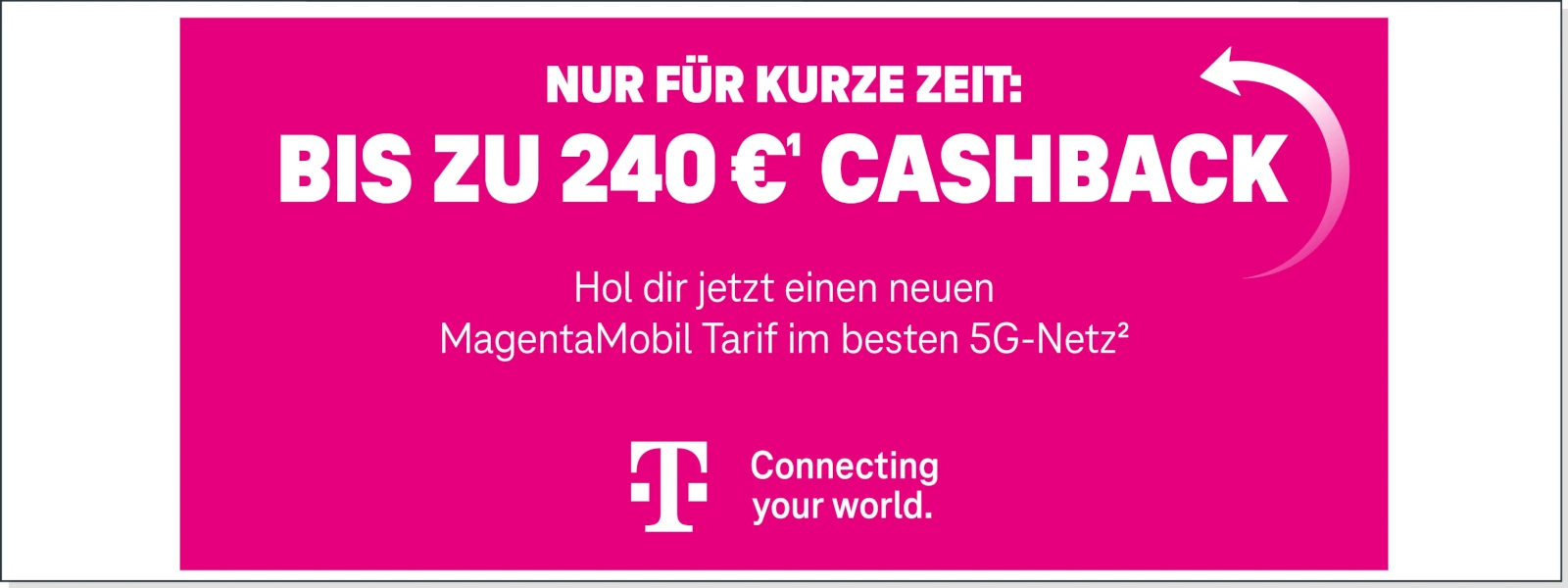 1) Im Aktionszeitraum 01.10.–18.11.2025 erhalten Kunden bei Ab-schluss eines neuen Mobilfunk-Vertrags mit einer Mindestvertragslaufzeit von 24 Monaten in den Tarifen MagentaMobil XS und S mit oder ohne Endgerät einen Cashback in Höhe von 120 € sowie in den Tarifen MagentaMobil M, L und XL mit oder ohne Endgerät einen Cashback in Höhe von 240 € gutgeschrieben (ausgeschlossen sind PlusKarten Tarife, Young Tarife, Special Tarife, DTAG-Tarife, for Friends Tarife sowie Corporate Benefits Tarife und Datentarife). Einmaliger Bereitstellungspreis jeweils 39,95 €. Die Gutschrift ist nicht mit weiteren Aktionspromotions wie z. B. 6 Monate Grundpreisbefreiung kombinierbar. Zum Erhalt der Gutschrift (nach Ablauf der Widerrufsfrist) ist vom 01.11.2025–31.07.2026 eine Online-Registrierung über die MeinMagenta App (mit Klick auf Ihr Profil, „Cashback einlösen“) unter Vorlage der ersten Rechnung entsprechend den genannten Bedingungen erforderlich.
