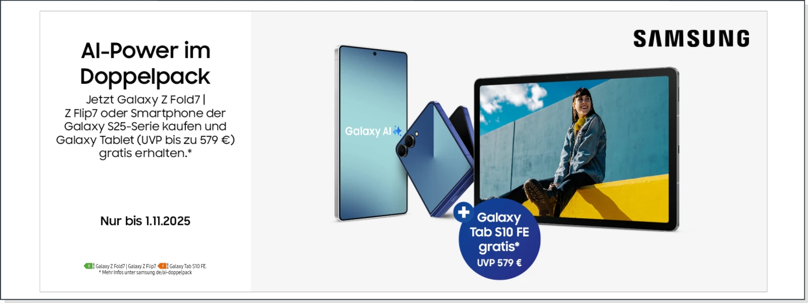 **Für private Endkunden ab 18 Jahren. Beim Kauf eines neuen Galaxy Z Fold7 | Z Flip7 | Z Flip7 FE oder Galaxy S25 Ultra S25+|S25|525 Edge | S25 FE mit entsprechender EAN („Aktionsgerät") zwischen dem 6.10. und dem 1.11.2025 bei in Deutschland ansässigen teilnehmenden Händlern/Netzbetreibern (inklusive Samsung Online Shop/Samsung Shop App) erhalten Kunden ein Galaxy Tab S10 FE in Gray mit 128 GB (Galaxy Z Fold7 | Z Flip7 | Z Flip7 FE |S25 Ultra|S25+ || S25 Edge) oder ein Galaxy Tab A11 in Gray mit 64 GB (Galaxy S25 | S25 FE) als Gratiszugabe („Zugabe"). Bei der Telefónica Germany GmbH & Co. OHG gilt für das Galaxy S25 FE ein verlängerter Aktionszeitraum vom 6.10. bis 5.11.2025. End-kunden sind selbst dafür verantwortlich, dass das erworbene Aktionsgerät eine EAN aufweist, die zur Teilnahme berechtigt. Für den Erhalt der Zugabe ist eine Registrierung nach Erhalt des Aktionsgerätes über die auf dem Aktionsgerät vorinstallierte Samsung Members App unter der Rubrik „Vorteile" unter Angabe der Kontaktdaten sowie der IMEI-Nummer des Aktionsgerätes plus Hochladen des Kaufbelegs (bei Erwerb im stationären Handel) bzw. der Bestell-bestätigung und Rechnung (bei Erwerb im Online-Handel) ab dem 6.10. und bis zum 13.11.2025 (Ausschlussfrist) erforderlich. Voraussetzung für die Registrierung ist die Anmeldung mit einem Samsung Account (samsung.de/ account-login). Ein Nachreichen der bei der Registrierung erforderlichen Angaben ist nicht möglich. Die Zugabe wird in der Regel innerhalb von 45 Werktagen an die bei der Registrierung angegebene Lieferadresse in Deutschland ver-schickt. Bei endgültiger Kaufrückabwicklung innerhalb von zwölf Monaten ist die Zugabe zurückzugeben bzw. Wertersatz maximal in Höhe der unverbindlichen Preisempfehlung von 579,00 € (Galaxy Tab S10 FE) oder 179,00 € (Galaxy Tab A11) zu leisten. Jeder private Endkunde kann mit maximal drei Aktionsgeräten an der Aktion teilnehmen. Solange der Vorrat reicht. Samsung behält sich eine vorzeitige Beendigung der Aktion vor, insbesondere wenn der Vorrat ausgeschöpft ist. Die Aktion ist nicht kombinierbar mit anderen Aktionen, Gutscheinen, Zuschüssen, Boni, Rabattaktionen von Samsung oder Mitarbeiterportalen. Aktion im Einzelnen, vollständige Teilnahmebedingungen sowie Details zum Registrierungsprozess unter samsung.de/ai-doppelpack. Ausrichter der Aktion ist Samsung Electronics GmbH, Frankfurter Straße 2, 65760 Eschborn, Deutschland.