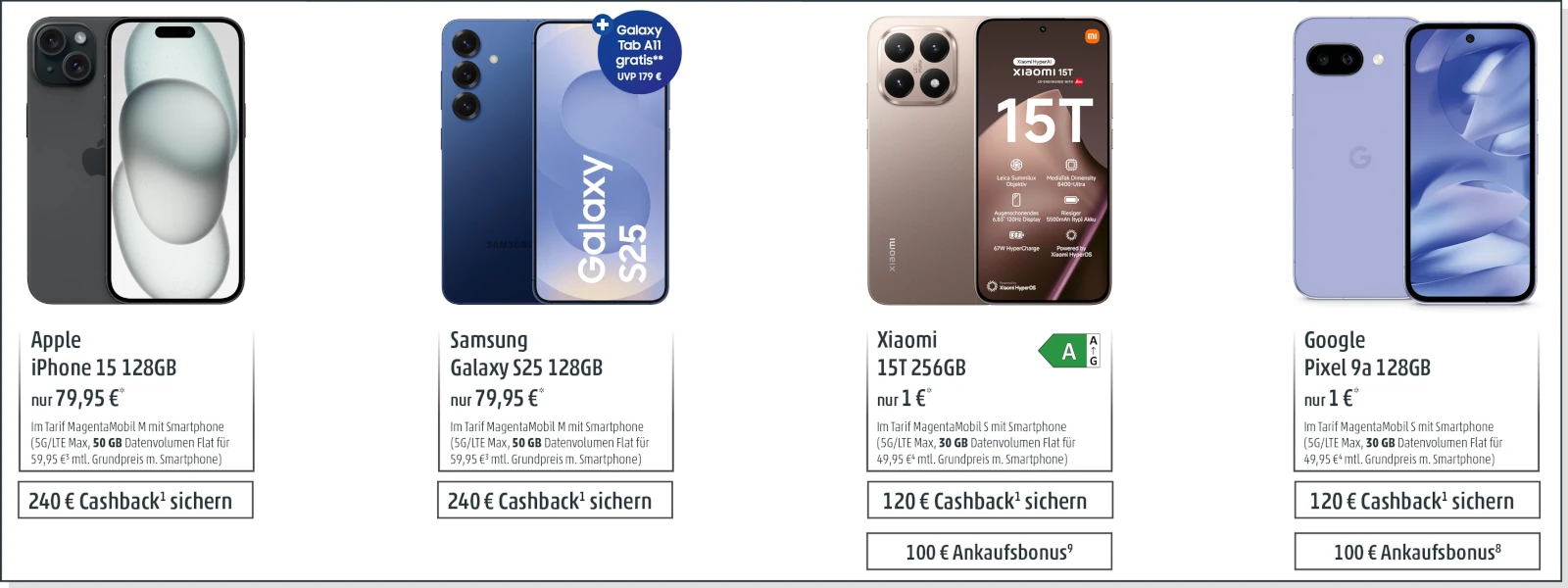 9) Der Ankaufsbonus gilt für private Endkunden ab 18 Jahren bei Kauf eines der im Folgenden genannten Smartphone- Modelle vom 24.09.–31.12.2025 bei der Telekom Deutschland GmbH (TDG) und bei zusätzlichem Verkauf eines teilnahmeberechtigten Smartphones an die Assurant Deutschland GmbH. Das Handy-Ankaufsangebot für das Altgerät muss bis zum 31.12.2025 generiert werden und das Altgerät bis zum 21.01.2026 bei der Assurant Deutschland GmbH bzw. ihrem Dienstleister eingegangen sein. Teilnehmer erhalten ein Ankaufsangebot für das Altgerät, zzgl. eines Ankaufsbonus. 100 € gibt es beim Kauf eines Xiaomi 15T oder Xiaomi 15T Pro. Das Altgerät muss funktionsfähig sein, d. h., es muss ein- und ausschaltbar sowie entsperrt (kein SIM-/Net-Lock) sein, darf keinen Wasserschaden oder Displaybruch aufweisen und muss einen Mindestankaufswert von 1 € haben. Teilnahme mit max. 3 Aktionsgeräten pro Haushalt. Solange der Vorrat reicht. Ausrichter der Aktion ist die Telekom Deutschland GmbH, Landgrabenweg 149, 53227 Bonn, Deutschland. Die Teilnahmebedingungen sind unter telekom.de/handyankauf einsehbar.