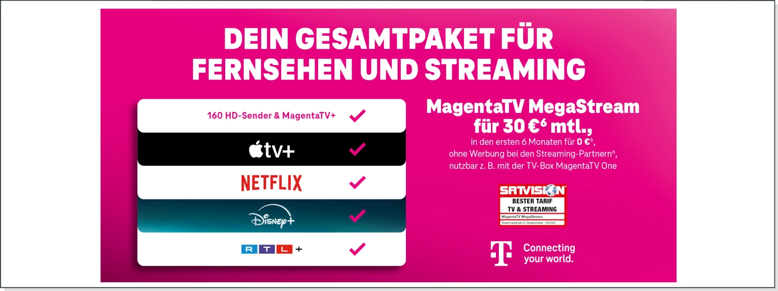 6) Aktion gilt bis 02.02.2026 für MagentaTV Neukunden. MagentaTV MegaStream kostet in den ersten 6 Monaten 0 €/Monat, danach 30 €/Monat. Mindestvertragslaufzeit 24 Monate. MagentaTV ist über die MagentaTV App ohne zusätzliche Hardware empfangbar. Auf Wunsch kann die TV-Box MagentaTV One für 5 €/Monat, zzgl. 6,95 € Versandkosten, mit einer Mindestvertragslaufzeit von 12 Monaten gemietet werden. Alle Preise inkl. der gesetzlichen MwSt. MagentaTV MegaStream enthält RTL+ Premium, Netflix Standard, Disney+ Standard und Apple TV+ (jeweils HD verfügbar). Voraussetzung für die Buchung und Nutzung von Netflix, Disney+ und Apple TV+ sind ein Wohnsitz in Deutschland sowie die Registrierung und Akzeptanz der Nutzungsbedingungen. Es gelten gesonderte Datenschutzbestimmungen bei Netflix International B.V. und Disney+. Bei Nutzung über das Mobilfunk-Datennetz erfolgt die Belastung des Datenvolumens beim jeweiligen Mobilfunk-Anbieter. Ein Angebot von: Telekom Deutschland GmbH, Landgrabenweg 149, 53227 Bonn.