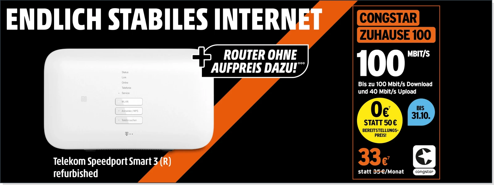 7) Neukundenaktion bis zum 31.10.2025. congstar Zuhause 100 kostet 33 statt 35 €/Monat. Mindestvertragslaufzeit: 24 Monate. Einmaliger Bereitstellungspreis: 0 € statt 50 €. Voraussetzung für die Nutzung des Tarifs ist ein geeignetes Endgerät (gegen Aufpreis erhältlich) congstar Zuhause 100 ermöglicht eine Datennutzung von max. 100 Mbit/s im Download und 40 Mbit/s im Upload. Ohne Festnetz-Telefonie. congstar Zuhause ist in vielen Anschlussbereichen verfügbar. Vertragspartner der Festnetzleistung: congstar, eine Marke der Telekom Deutschland GmbH, Bayenwerft 12–14, 50823 Köln.